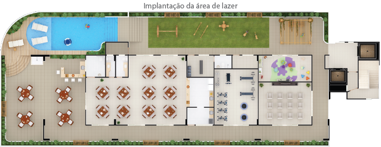 Deck com bar  Piscina com prainha  Salão de festas  Brinquedoteca  Playground